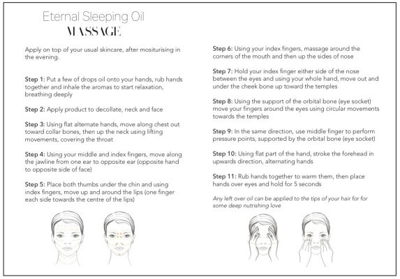 - Eternal Sleeping Oil : apply after regular cleaning of the face and after your client’s moisturiser, spreading a few drops of then product on the face, neck, and neckline, and with the fingertips gently spreading and massaging it into the face with upward movements.